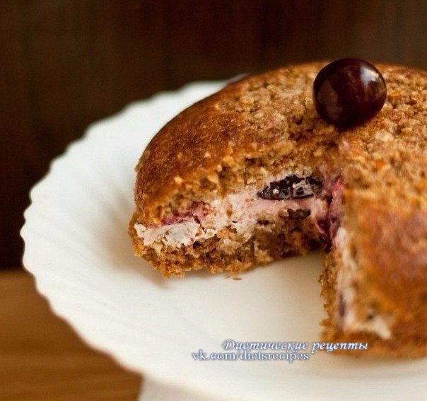 Сделать тесто из овсянки, какао, ряженки и яиц. В форму для выпекания выложить половину получившейся смеси, затем выложить на нее вишню. И сверху залить оставшимся тестом! Выпекать до готовности теста при 180 градусах.