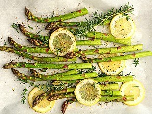 Разогрей духовку до 200 градусов. Нарежь тонкими дольками половину лимона. Выложи спаржу с лимонными дольками и розмарином на лист для выпечки (используй пергаментную бумагу). Приправь оливковым маслом и специями. Сбрызни соком второй половины лимона. Готовь 7 минут, аккуратно переверни спаржу и запекай еще минут 7-8, до готовности.
