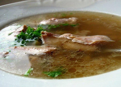 4. Мясо вынуть, остудить, отделить от костей и положить обратно в кастрюлю.