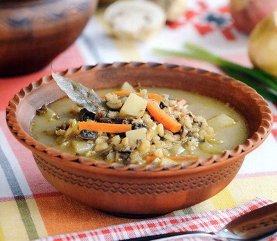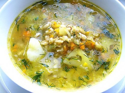 5. Вылить в кастрюлю бульон, добавить соль, перец, перловую крупу.