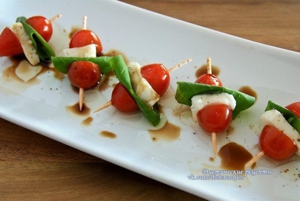 Нанизываем на шпажки или зубочистки поочередно помидоры, моцареллу и базилик. Выкладываем на красивое блюдо, сверху сбрызгиваем оливковым маслом и бальзамическим уксусом – готово!