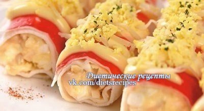 3.Соедините кальмаров с яичным белком, 1/3 нормы тертого сыра и частью сметаны. Крабовые палочки аккуратно разверните, положите начинку, затем сверните трубочками.