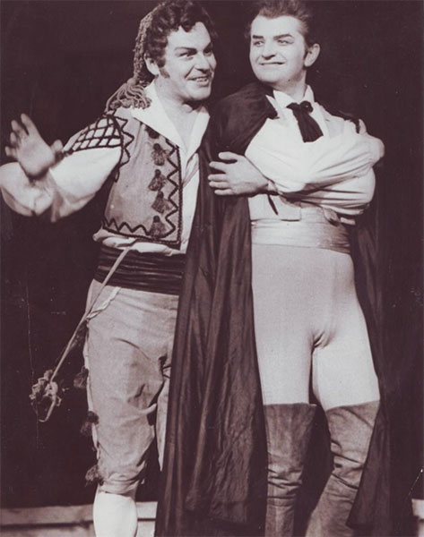 С Кларочкой Кадинской мы были знакомы, что называется, «с детства» т. е. с консерватории. Мы были с ней партнерами еще там в оперной студии и пели все того же «Севильского» и «Дуэнью». Это очень милая женщина с красивым голосом, прекрасный профессионал. Мне всегда доставляло большое удовольствие петь вместе с ней. С Бэлой Андреевной Руденко мне пришлось петь не очень много, т. к. она пришла в театр значительно позже меня. Из баритонов наиболее мне близкими были Е. Г. Кибкало и А. П. Большаков, И. А. Морозов и, позднее, Ю. А. Гуляев. Все они были очень доброжелательными людьми и прекрасными профессионалами. С ними всегда было как-то легко и надежно, очень уверенно. Когда они пели со мной, я ощущал какой-то особый «климат» и на сцене и за кулисами, какую-то незримую поддержку.