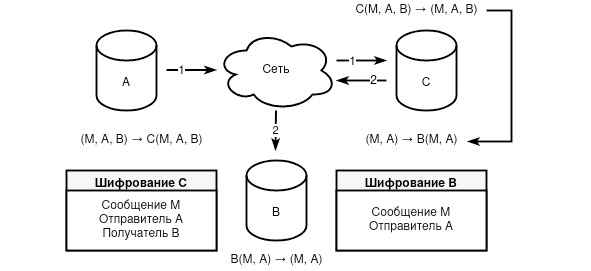 Рисунок 3. Коммуникация субъектов A, B посредством общего сервиса C