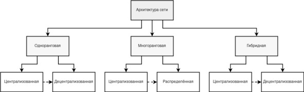 Все сетевые коммуникации строятся на определённых топологиях, архитектурах, задающих последующее их применение. Топологию можно рассматривать как со стороны более низкого уровня, вида «звезда», «ячеистая», «шина», «кольцо» и т. п. [25], [26], так и со стороны более прикладного уровня, как «многоранговая», «одноранговая», «гибридная» [27]. На первый взгляд, таковые определения дают однозначные соответствия: «многоранговая» = «звезда» ИЛИ «звезда + иерархическая» ИЛИ «иерархическая», «одноранговая» = «ячеистая» ИЛИ «полносвязная», «гибридная» = «иерархическая + полносвязная» ИЛИ «звезда + ячеистая» и т. д. Но по мере изучения будут явно прослеживаться противоречия таковых суждений, при которых «одноранговая» архитектура может становиться «звездой», «гибридная» – «иерархической» и прочее.