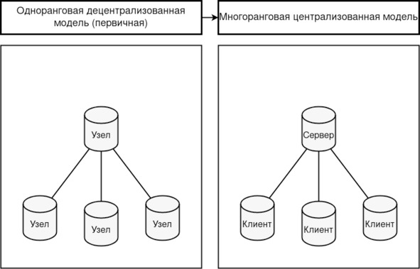 Рисунок 7. Становление многоранговой архитектуры из первичной одноранговой децентрализованной модели