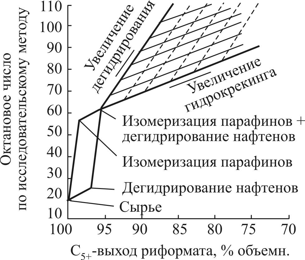 Роль отдельных реакций платформинга иллюстрируется на рис. 6: диаграмма построена для риформинга парафинистой бензиновой фракции ближневосточной нефти [9; 68]. На рис. 6 представлены теоретически возможные выходы и октановые числа при условии отсутствия крекинга на платине. Как следует из рисунка, самым эффективным маршрутом для повышения октанового числа является изомеризация и дегидроциклизация парафиновых углеводородов.