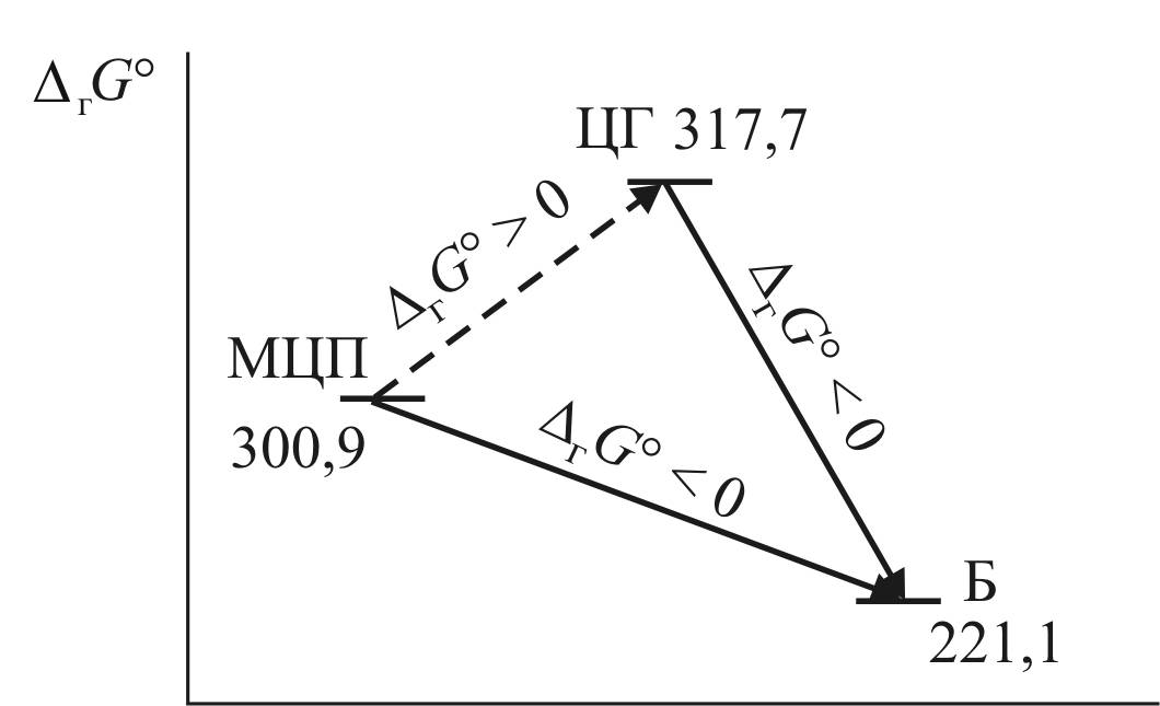 Рассмотренный случай (см. рис. 6) является одним из многих примеров того, как одиночная реакция, невозможная с позиции термодинамики, становится возможной при сопряжении с другой реакцией, обеспечивающей снижение энергии Гиббса для суммарного превращения.