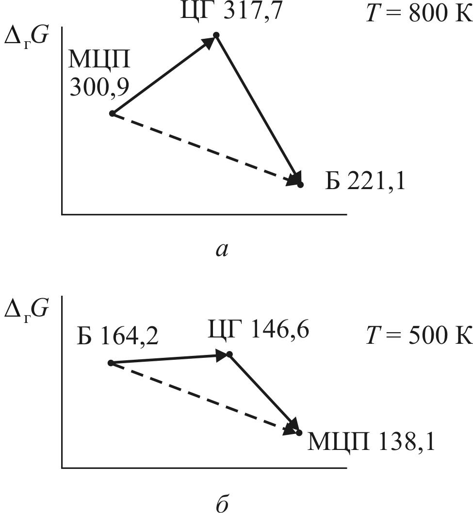 «циклогексан/метилциклопентан» значительно выше равновесного значения, то термодинамика запрещает протекание реакции в прямом направлении, а это делает принципиально невозможным ароматизацию парафиновых углеводородов, которая тем не менее в реальных условиях успешно осуществляется через механизм С5-циклизации. Данное противоречие разрешается при включении в цепочку превращений реакции дегидрирования циклогексана в бензол, которая имеет большое негативное изменение энергии Гиббса. В этом случае суммарное превращение происходит со значительным уменьшением энергии Гиббса (рис. 7).