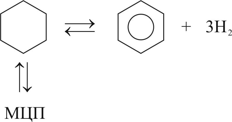 Основные химические реакции платформинга протекают с большим уменьшением энергии Гиббса и поэтому имеют высокие значения констант химического равновесия Kp. Исключением являются реакции изомеризации н-алканов и 5-членных нафтенов, а также реакции дегидрирования алканов. Для этих реакций константы равновесия оказываются меньше единицы в связи с небольшим положительным значением энергии Гиббса. Несмотря на невысокие константы равновесия, эти реакции играют важную роль в химической трансформации сырья каталитического риформинга. Ниже это показано на примере реакции изомеризации метилциклопентана в циклогексан.