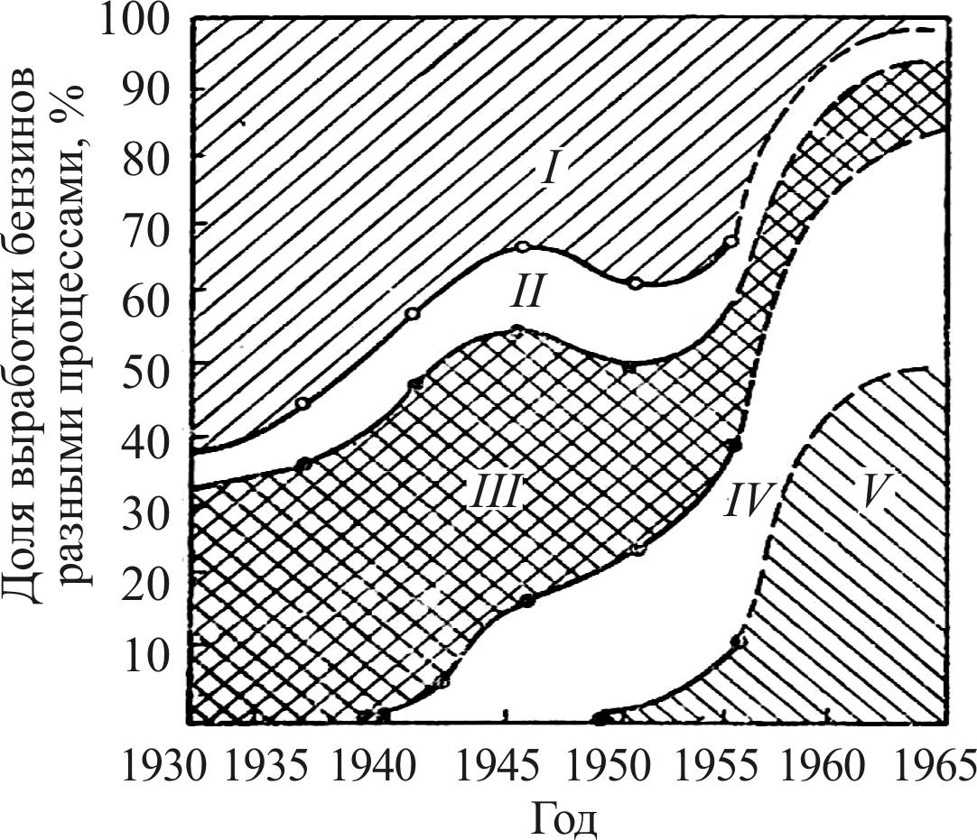 Изменение структуры производства автомобильных бензинов в США с внедрением процессов гидроформинга и платформинга представлено на рис. 5 [21].