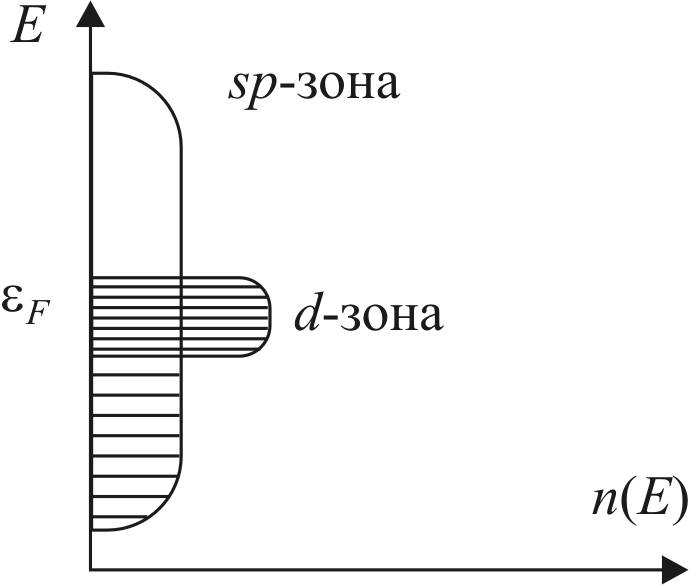 50%-ный s-характер sp-орбиталей обеспечивает сильное перекрывание и расщепление энергетических уровней образующихся орбиталей, что приводит к формированию широкой зоны, правда, с маленькой плотностью электронных состояний из-за ограниченного количества s и p-электронов – максимум два электрона на атом переходного металла. Sp-зона играет важную роль в начальном взаимодействии молекулы с поверхностью, обеспечивая снижение энергии адсорбата, однако это взаимодействие не приводит к расщеплению энергетических уровней и активации молекулы и не является причиной различий каталитических свойств металлов. Эти различия обусловлены структурой d-зон переходных металлов.