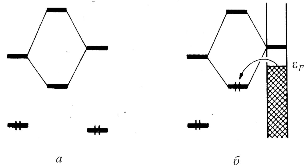 Рассмотренные 4-электронные взаимодействия показаны на рис. 29, где а соответствует взаимодействию двух молекул, б – молекулы с поверхностью металла.