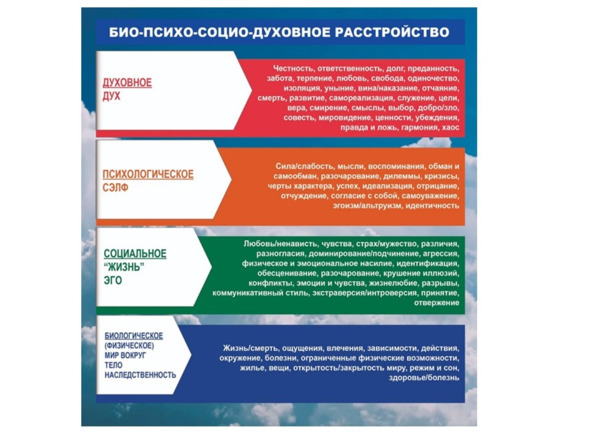 Исследование корней психосоматических расстройств, химических и нехимических аддикций в последние десятилетия убеждает, что в их основе лежат проблемы био-психо-социо-духовной природы (Табл. 1)
