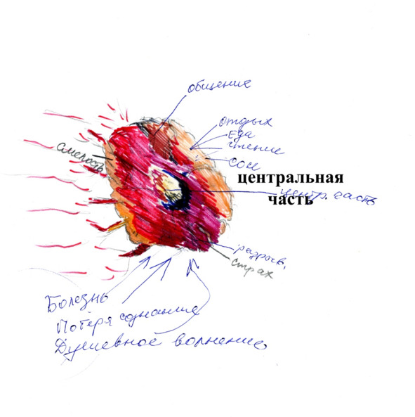 Арт-анализ, проведенный на второй сессии, выявил признаки диффузной идентичности, подтверждая пограничную личностную организацию подростка и его симптомы, носящие регрессионный характер (см. рис.4). Психотерапия с юношей проводилась по интегративной модели, позволив в конце курса «разбить гранит его астмы» (см. рис.5). Участие в кружке юных спасателей в какой-то степени заменило ему групповую психотерапию. Юноша использовал свой ресурс, поступив на факультет изобразительного искусства.