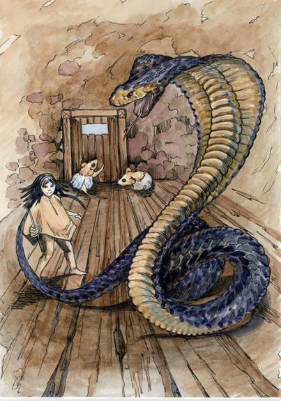 От этого жуткого звука мышата оцепенели и покрылись холодным потом. Они даже не могли сдвинуться с места. Сандро отвёл их в дальний угол подвала и там они ждали появление змея. Дверь подвала хлопнула, на пороге показался Чёрный Дюк. Его пасть с острыми, ядовитыми зубами была широко раскрыта. Как бы ощупывая каждый сантиметр подвала, его немигающий взгляд медленно скользил от одного предмета к другому, пытаясь отыскать свои жертвы. Чёрный раздвоенный язык непрерывно двигался из стороны в сторону.