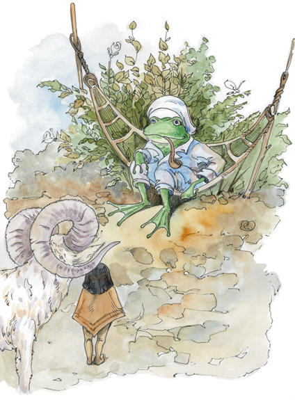 Сандро забрался на спину дядюшки Архара и горный козёл, как молния, помчался вниз. Не успел маленький кактус сосчитать и до ста, как они были уже у дома знаменитой лягушки.