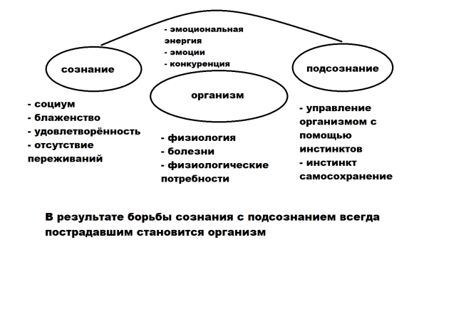 Однако если в организме сознание берёт вверх над подсознанием, то подсознание никогда этого не простит. Такой человек обычно начинает болеть, начинает страдать депрессией и другими заболеваниями. Сознание понимает, что животные инстинкты необходимо загасить, но это бесследно не проходит. Идеальный вариант – это когда сознание договаривается с подсознанием.