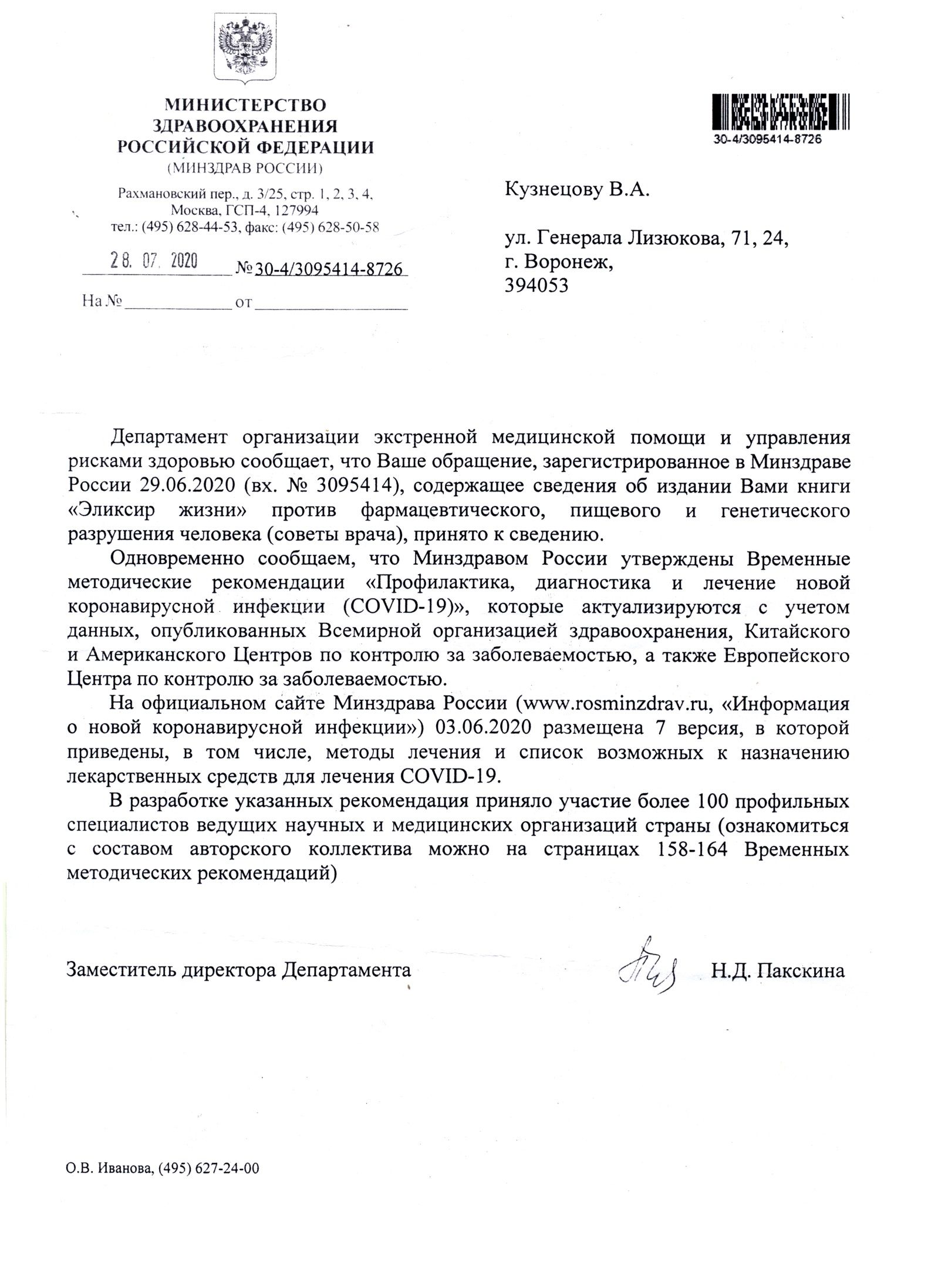 Изложенный в этой книге эффективный нелекарственный, недорогой, доступный, безопасный, естественный метод профилактики и в комплексе традиционного лечения коронавирусной, хламидиозной и других вирусно-бактериальных инфекций «термическим фактором» (до +500С) пастеризованной воды и жидкой умеренно горячей еды, был рассмотрен и дан положительный ответ в Минздраве России.