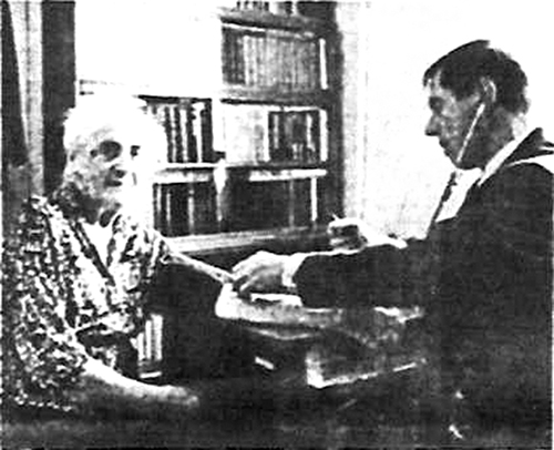 Врач продолжает листать записную книжку.... Иван Евстафьевич Садковский (1911 года рождения), Борис Александрович Васильев (1910), Илья Михайлович Корольков – участники Великой Отечественной войны; Антонина Иосифовна Прокофьева (1913), Анна Фёдоровна Осипова (1913), Александра Никифоровна Авсицерова (1912); Дарья Денисовна Зубкова (1910); Зинаида Николаевна Костюченко (1913); Серафима Александровна Теньшинская (1908); Евгения Марковна Тузман (1911). Примечательно, что живет дома и полностью обслуживает себя сама; Любовь Ивановна Семенкина (1914)…