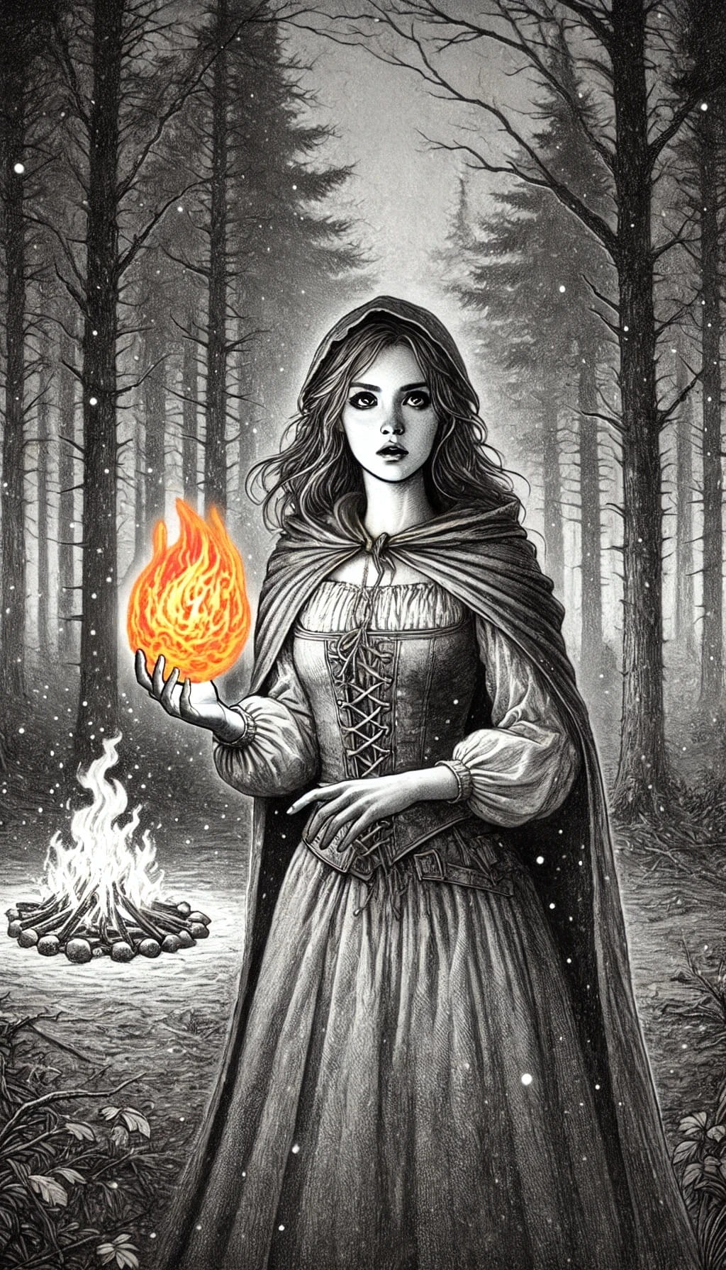 Немного поодаль они нашли небольшую поляну, окруженную низкими деревьями и несколькими валунами, которые могли послужить укрытием от ветра. Путники быстро взялись за дело: София развела костер, Виктория помогала обустроить лежанку, а Дорион отправился за хворостом. Пока они работали, небо стало совсем черным, ветер усилился, предвещая начало дождя.