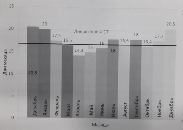 Количество дней с осадками в расчете на один месяц внутри усредненного года (204:12= 17 дней). Месяц с превышающим данный порог (17) количеством осадочных дней можно назвать «мокрым».