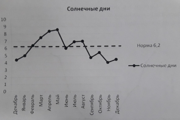 Суммарное количество солнечных дней по годам колеблется от минимум 43 (1990 год) до максимум 137 (1984 год) при среднем многолетнем значении- 66,5, что соответствует среднему показателю за месяц – 5,5 солнечных дней. Месяц с величиной солнечных дней больше 5,5 следует считать «солнечным».