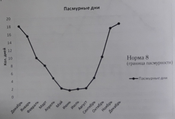 Средняя многолетняя величина пасмурных дней в расчете на один месяц составляет – 8.