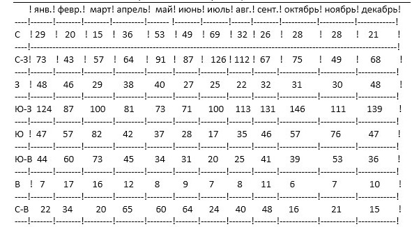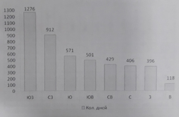 Из всех ветров заметно выделяются три: юго-запад, северо-запад и восток. Но абсолютный лидер (Ю-З) при всем при том является господствующим носителем не во всех месяцах. Таковым он является в (типичном) январе, феврале, марте, апреле, августе, сентябре, октябре, ноябре, декабре – т.е. практически в большинстве месяцев, за исключением мая, июня и июля.