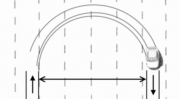 Test of steerability. Gain certain speed, press the clutch pedal and quickly turn the steering wheel to fixed angle. After vehicle is rotated 180 degrees, determine the distance between the starting and ending positions of car.