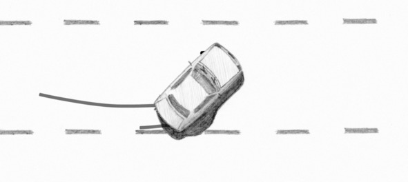 During pass the corner we provoke drift by throttling. Then we hit the throttle and brake pedals at the same time. The front wheels were locked, and there was traction from the engine retained on the rear wheels. Rear unloaded wheel began to skid. Trajectory straightened and drifting stopped. There are visible tyre traces, left by locked front wheels and unloaded rear wheel, which slipped on the asphalt.