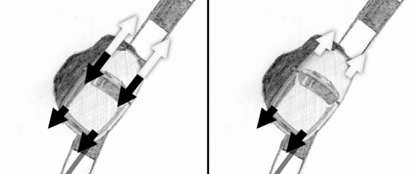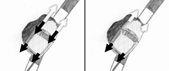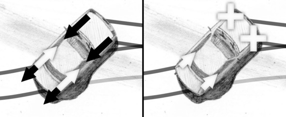 The left figure shows equivalent forces generated by braking (black arrows) and engine torque (white arrows). Figure on the right shows resulting equivalent forces on the front wheels after subtracting the braking effort from engine torque. A greater amount of torque on loaded front wheel means that more engine power will be transferred to the wheel compared to situation, when a zero-friction differential was installed.