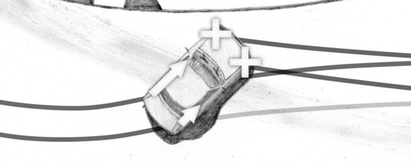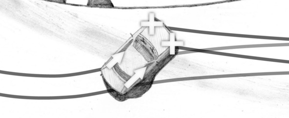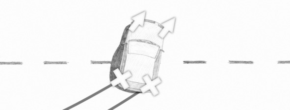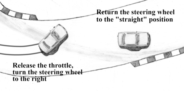 At the end of “throttle+brake” technique it is enough to align trajectory with a corrective steering. If it is necessary to avoid an obstacle or bend trajectory because of other reasons, you should turn the front wheels previously, during perform the technique, when the front wheels are locked.
