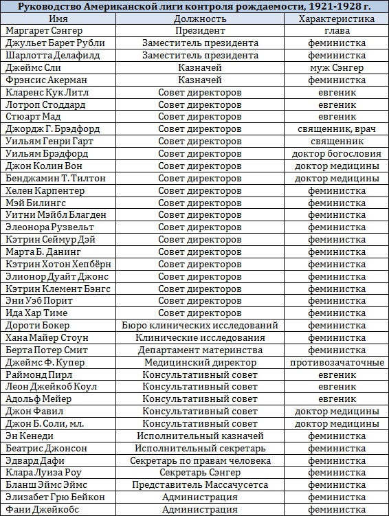 Основой руководства и кадрового состава были сотрудники журнала Вестник контроля рождаемости, а также соратники и покровители Сэнгер. Выше в таблице показаны руководители Лиги в период 1921-1928 годов, их должность и дана краткая характеристика. Мы видим сборище влиятельных феминисток и евгеников. В Совете директоров значатся: жена будущего президента США Элеонора Рузвельт; Кларенс Кук Литл – известный учёный генетик и влиятельный евгеник, который в 1929 году стал президентом Американского общества евгеники; Лотроп Стоддард – видный евгеник и деятель контрацептивного движения, отпетый расист, член Ку-клукс-клана, клинический русофоб, автор понятия «подчеловек» (Under-Man), которое немецкие нацисты взяли на вооружение как «недочеловек» («унтерменш»), особо его волновала проблема низкой рождаемости у «высших» классов и высокой – у «низших».