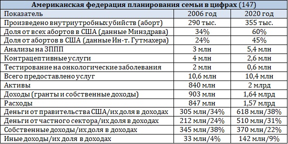 Можно смело сказать, что аборты по желанию женщины стали возможны благодаря АФПС, феминистического движения, «правозащитников» и их агентов (1973 год, решение Верховного суда по делу «Роу против Уэйда»). АФПС начала открытую деятельность по их легализации в ноябре 68-го, тогда ими принята резолюцию в данной сфере. Хотя, считается, что Сэнгер выступала против внутриутробных убийств, но за, если вынашивание и роды несут угрозу матери. Уже в 1973 году они произвели около 20 тыс. абортов (132), сегодня Федерация выступает крупнейшим абортарием в США, ежегодно производится около 370 тыс. операций, это более половины от всех по стране, «достижения» с годами растут. В период с 1 октября 2019 по 30 сентября 2020 года они абортировали рекордное число – 383 460 (133). Для сравнения, в 2020 году в США родилось 3,6 млн детей, согласно официальным данным, убито в утробе по меньшей мере 600 тыс., а по оценке Института Гутмахера – 800 тыс. При наличии хорошей медицинской страховки операции бесплатные, средняя стоимость около 1,2 тыс., наиболее сложные и на поздних сроках обходятся в более чем 3 тыс.