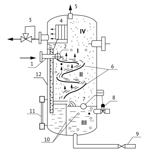 I – основная сепарационная секция; II – осадительная секция; III – секция сбора нефти; IV – секция каплеудаления; 1 – патрубок ввода газожидкой смеси; 2 – раздаточный коллектор со щелевым выходом; 3 – регулятор давления «до себя» на линии отвода; 4 – жалюзный каплеуловитель; 5 – предохранительный клапан; 6 – наклонные полки; 7 – поплавок; 8 – регулятор уровня и линии отвода нефти; 9 – линия сбора шлама; 10 – перегородки; 11 – уровнемерное стекло; 12 – дренажная труба.