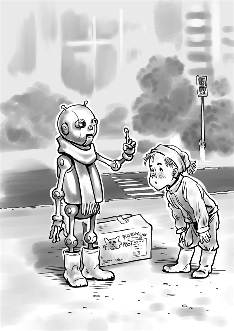 – Держи не кондицию. Уронили до тебя. Котам хватит. Только… – дед оглянулся на мужиков, с которыми вместе работал и как заговорщик понизил голос. – … не приходите сюда больше. Ну её, эту роботизацию. Нас же взашей отсюда погонят. А нам ещё семьи кормить. Понял меня, робот?