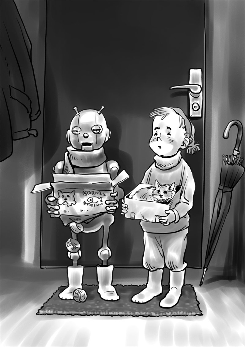 Дед так и замер в коридоре. Проводив взглядом внука с роботом, он лишь озадачено погладил котёнка. Тот мяукнул.