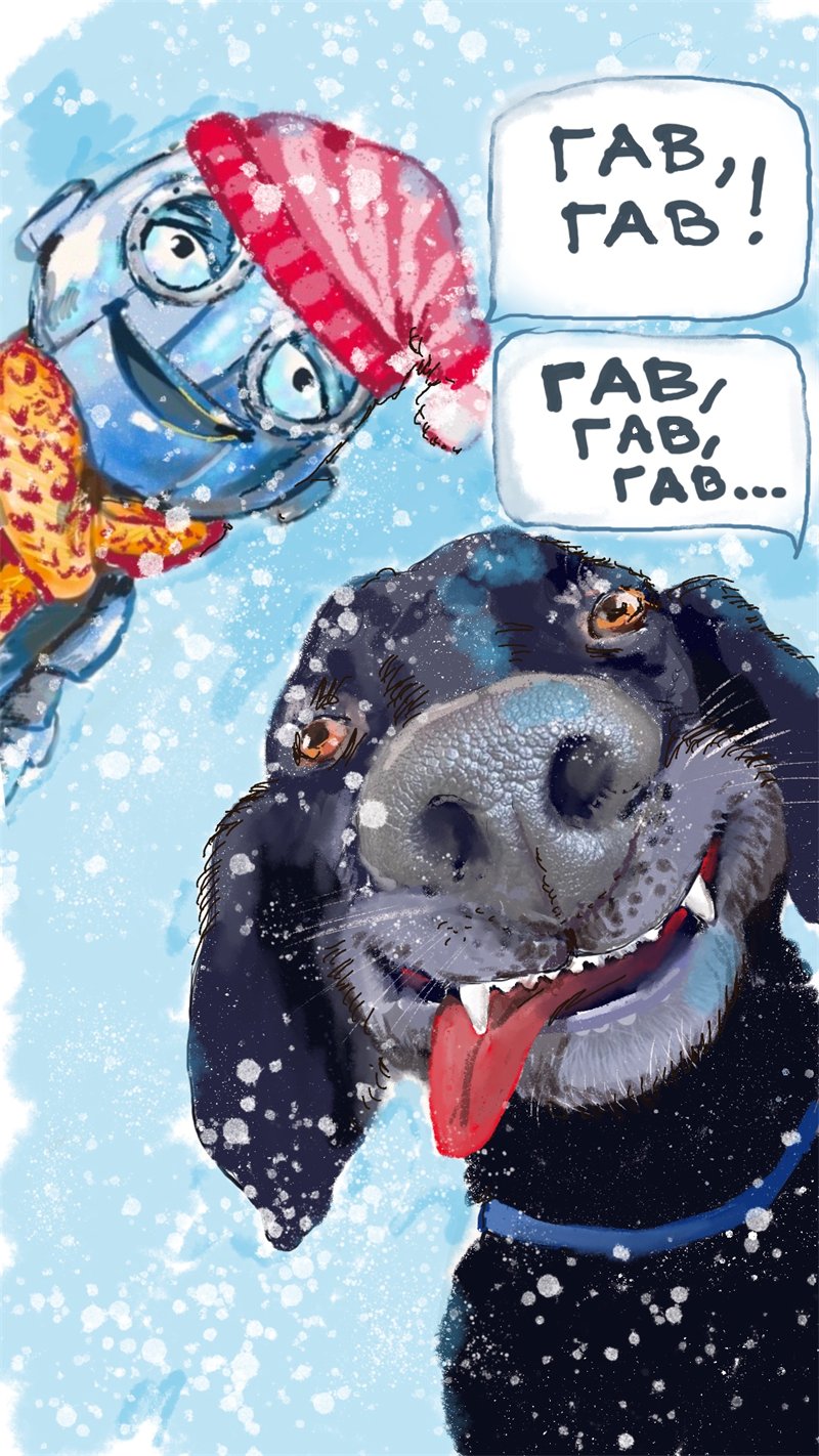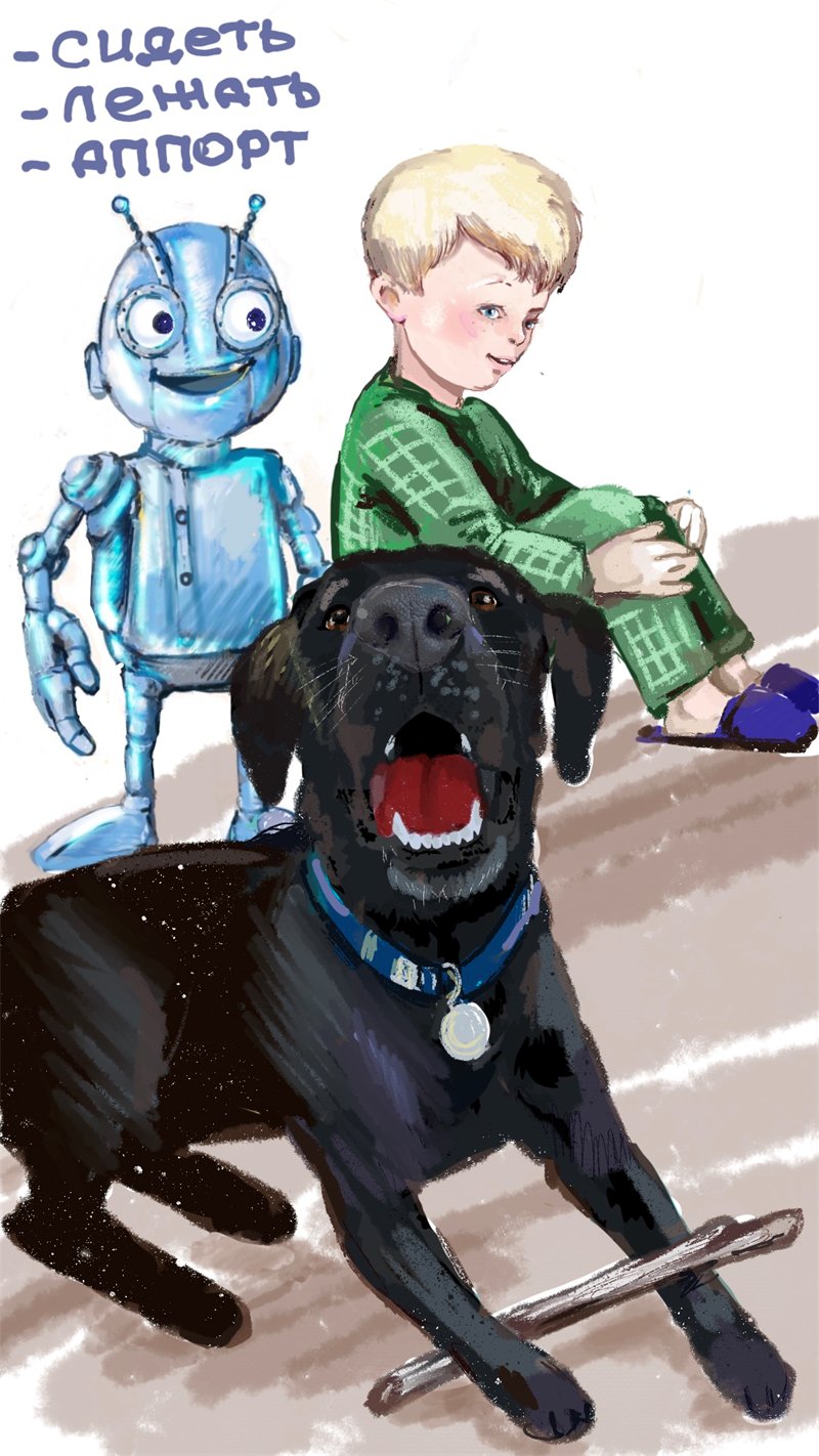 В глазах робота возникли знаки вопросов. Он смотрел то на папу, то на вдруг «заговорившую» собаку.