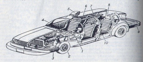 БЕЗОПАСНОСТЬ АВТОМОБИЛЯ (МОТОЦИКЛА) – комплекс мероприятий, связанных с конструированием машины и условиями ее эксплуатации, обеспечивающих предотвращение или минимизацию дорожно-транспортных происшествий, а также снижение травматизма водителя, пассажиров и пешеходов. Для этого автомобиль (мотоцикл) должен иметь безотказную работу всех агрегатов, узлов и систем, повышенную устойчивость и эффективность тормозов, надежную управляемость и хорошую обзорность, и другие факторы, обеспечивающие активную и пассивную безопасность. В понятие «безопасный автомобиль» может включаться (рис.): 1 – двойная противопожарная переборка; 2 – колесо из магниевого сплава, без колпака; 3 – выдвижной бампер; 4 – ветровое стекло без искажений; 5 – перископ зеркала заднего обзора; 6 – передняя арочная стойка кузова; 7 – мягкая внутренняя обшивка крыши; 8 – регулируемый подголовник, 9 – задний бампер; 10 – средняя арочная стойка кузова; а также подушки безопасности, травмобезопасные элементы салона, включая руль, рычаги и др.