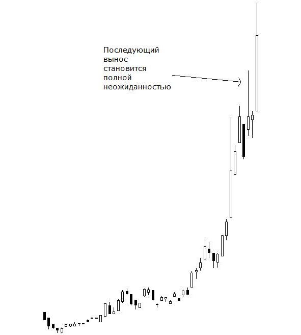 При этом страх навязывает «подход от обратного»: если некий сценарий представляется нереалистичным (например, дальнейший рост) и оттого – самоубийственным, то его противоположность (падение) автоматически становится надёжной и безопасной. Например, после долгого безоткатного роста появляется мощная медвежья свеча, которая воспринимается, как сигнал к продаже. Покупка в таких условиях представляется чистым самоубийством. Соответственно, продажа воспринимается в качестве единственно возможного сценария. Он представляется сам собой разумеющимся.