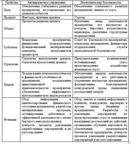 Итак, по нашему мнению, основную функцию в борьбе с влиянием негативных факторов на деятельность предприятия (как в стабильных условиях, так и в условиях кризиса) должно выполнять антикризисное управление во взаимосвязи с системой экономической безопасности организации. Для более глубокого исследования взаимосвязей между антикризисным управлением и экономической безопасность выделены следующие их свойства, а именно: предмет, объект, субъект, основная цель, стратегия, задачи, функции, что отражено в таблице 1.1.