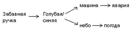 Теперь, что касаемо проявления и значения этой погрешности в работе сознания. Само собой, и об этом уже было сказано, из-за погрешности неясен сам образ, но как влияет погрешность на взаимодействие образов? Влияние же здесь достаточно значительное. Допустим мыслительная операция дошла до образа «голубой», вернее даже неясный голубой. Но такой «неясный голубой» со значением «9» есть так же и «синий»; так как же дальше пойдет мыслительная операция: от «голубого» или от «синего»? Это вопрос случайности. Например, если от «голубого», человек в следующее мгновение представите небо, если же от «синего», представит, допустим, свою машину. Машина же и небо, как образы, уже не пересекаются, и далее мышление пойдет уже по какому-то одному, конкретному направлению. Это можно проиллюстрировать следующим образом (рис. 3)