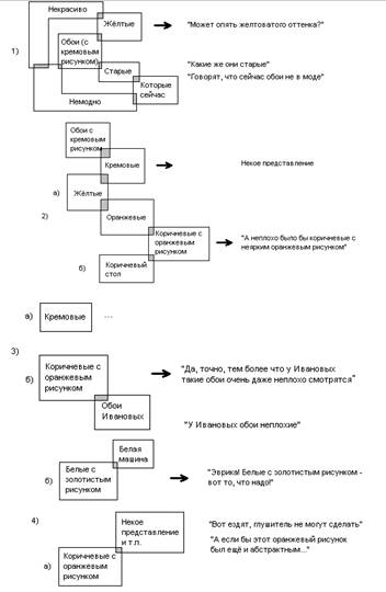 Поясняю. Образы и их «переплетение» то же самое, что и на прошлом рисунке, ибо здесь всего лишь подстановка реального под прошлую «отвлечённость». Стрелкой обозначены те образы, от которых пойдёт мышление на следующем «этапе». Фраза напротив стрелки – это мысль, возникающая вследствие появления и приобретения высокого приоритета данным образом. Фразы пониже – сопутствующие мысли. Они не чётки, зачастую даже не осознаются, но фоном подобные мыслишки всё же проскакивают (по крайней мере потенциально, хотя и совсем не обязательно). Немного добавлю: образ «обои Ивановых» ещё свеж в памяти и т.к. в своё время они произвели впечатление, их изначальный приоритет достаточно высок. Образ «белая машина» означает ситуацию, когда за окном громко проехала машина белого цвета. Конечно, обычно не всё так ясно, но суть, я полагаю, ясна. Здесь же, кстати, вторая фоновая мысль является тем самым образом 17.