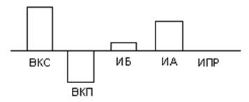 В свете вышесказанного отмечу, что удовольствие или неудовольствие вызываемое образом определяется не только ссылками ВКС или ВКП, но и ссылками остальных инстинктов. Т.е. если, например, ссылки всех инстинктов будут положительными, и лишь у одного ссылка будет отрицательная (пусть, к примеру, у ВКП), то образ все равно будет вызывать неудовольствие. Хотя оно может и почти не чувствоваться, если уровень положительных ссылок достаточно высок. Примером вышеприведенного случая может быть образ «оскорбить обидчика». Графически ссылки этого образа будут выглядеть, например, так (рис. 12):