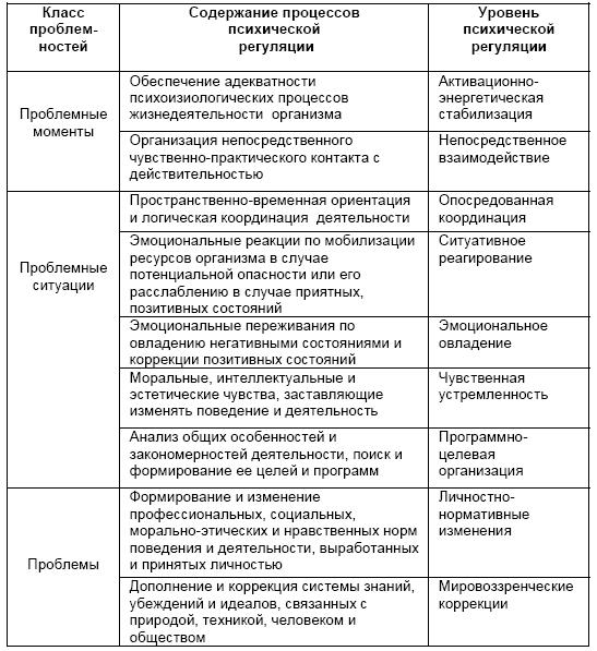 По-видимому, с помощью традиционного текстового описания удается более адекватно отразить гибкость и многоуровневость психической регуляции, чем посредством блочно-схематических изображений. Возможно, этим объясняется тот факт, что именно традиционный язык применялся для анализа и описания уровней психической регуляции, а используемые в отдельных случаях схемы и таблицы носят скорее характер дополнения к текстам.