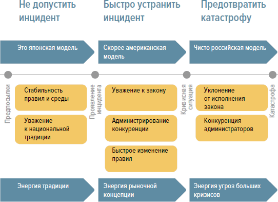 На втором этапе, когда инцидент уже проявлен и надо его быстрее устранить, наиболее эффективно работает американская модель: уважение к закону, администрирование конкуренции, быстрое изменение правил, когда к изменениям надо быстро приспособиться.