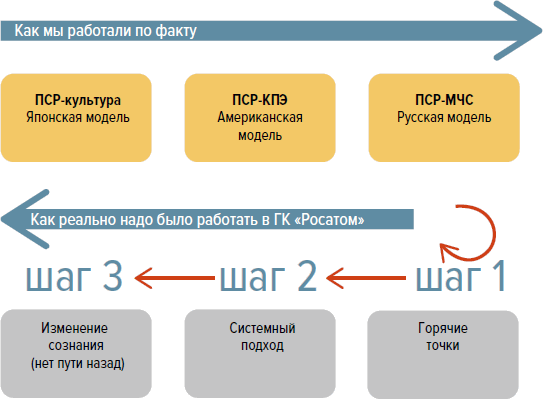 Оказывается, Toyota начала с нами работать сразу в ПСР-культуре по своей японской модели в зоне стабильности, чтобы делать образцы и двигаться слева направо. А русская ментальность требует прямо противоположного подхода. Мы должны были сразу пойти в самые горячие точки, где максимально проявляется русская модель управления, и через ПСР-ЧС, через быстрые заказы и быстрое нахождение решения вопросов их реализации завоевывать авторитет. И дальше, уже справа налево, двигаться к системе, а затем – к культуре.