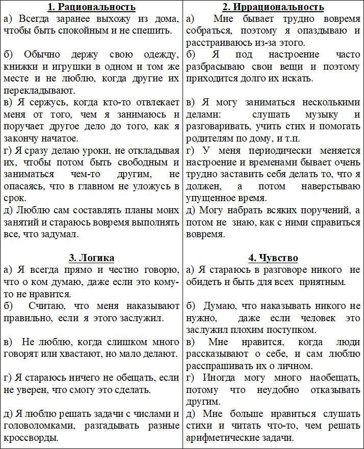 Наблюдая за поведением детей в игре можно заметить, насколько им характерна равномерная работоспособность, последовательность в решении поставленной цели или, наоборот, спонтанность в процессе совместной деятельности, резкая смена активности и пассивности, переключение интереса от одного объекта к другому. Первое говорит о преобладании признака рассудительности (рациональности), а второе – о перевесе элемента восприимчивости (иррациональности) в личности ребёнка. О рациональности детей можно судить, наблюдая их склонность во всех занятиях доводить начатое дело до конца. Иррациональные дети чаще склонны переключать внимание и отвлекаться на новые занятия, не окончив прежних. Рационального ребёнка трудно переубедить в чем-то, заставить изменить свое мнение. Иррационалы могут сами легко менять свои убеждения по ходу игры или занятий.