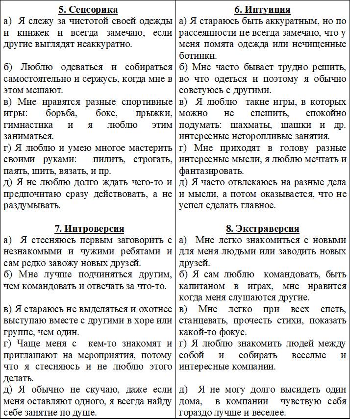 Введенные нами названия типов личности были приняты исходя из многолетнего опыта наблюдения за людьми разного возраста и пола. Подбирая мотивированные названия, мы старались учитывать их склонности, особенности мышления и поведения в быту, в формальных и неформальных ситуациях – в семье, с друзьями, в школе, в других учебных заведениях, в работе и на отдыхе, играх и развлечениях, спорах и конфликтах, в рутинных занятиях и в творчестве.